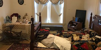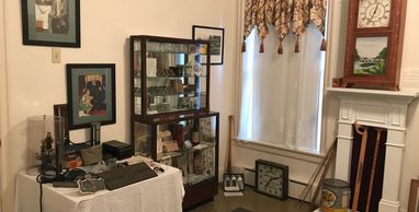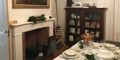 Dolly Harris and General Pickett original painting by Ron Lesser. Highchair, c. 1895. Selection of antique cookbooks from a huge collection located in the Barnes Library in the barn.