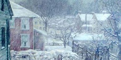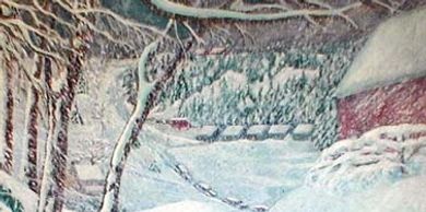Smith has also set up an amusing dilemma for the viewer to contemplate. There are two strings of cars traveling in opposite directions in only one open lane of traffic in a driving snowstorm. They converge behind the hill at the red barn. What will they do then? And why are there so many cars out at night in a snowstorm? Questions that are very thought provoking at this particular season of the year. One answer is: All the cars were not traveling together at the same time. The first two cars, which we can’t see, met head on and couldn’t go anywhere. Who was going to back up? As time passed, other cars were out and ended up "stuck" behind the first two.